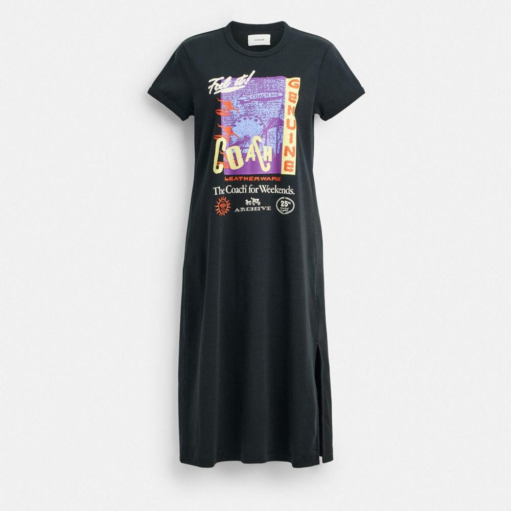 This ‘90s-inspired T-shirt dress features a playful collage graphic with a whimsical take on Coach iconography and California surf culture. Crafted of soft cotton, the long silhouette is finished with a side vent for ease of movement.