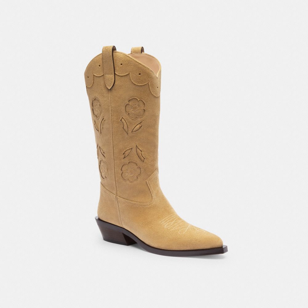 A western-inspired boot to kick up your days and nights, this soft suede Aria boot is embroidered with our Tea Rose motif and features a rubber outsole for added traction. The tall pull-on style is finished with a slanted block heel and our polished Signature hardware for a heritage touch.