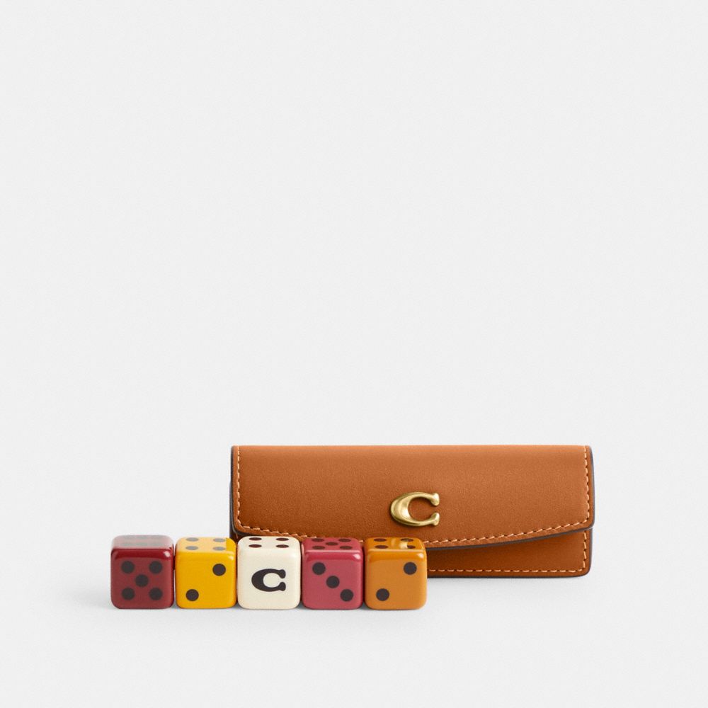 Bring a Signature touch to game night with our five-piece resin dice set. Inspired by colors originating in our archive, each die is embossed with our iconic serif C replacing the number one. This gift set comes housed in a hand edge-painted glovetanned leather case finished with a Coach snap closure. Packaged in a Coach gift box, it comes ready to roll.