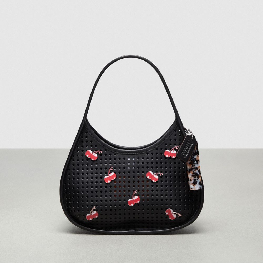 COACH®,Ergo Bag In Perforated Upcrafted Leather With Cherry Pins,Leather,Hobo,Plastic,Perforated,Tag Embellishment,Graphic...,Black,Front View