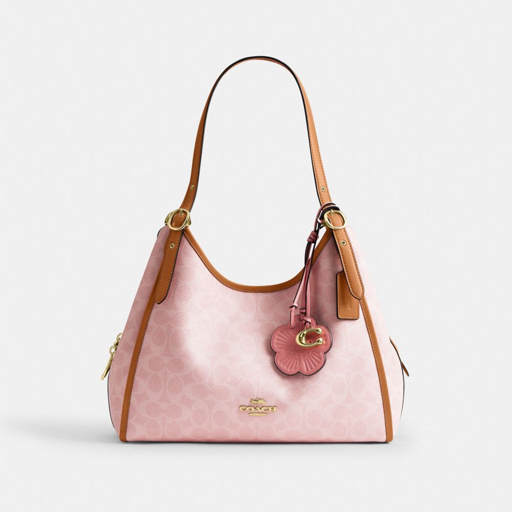 COACH®,Erin Shoulder Bag In Signature Canvas With Charms,Recycled Polyester,Leather,Canvas,Hobo,Metal,Logo,Piping,Casual,Pink,Angle View