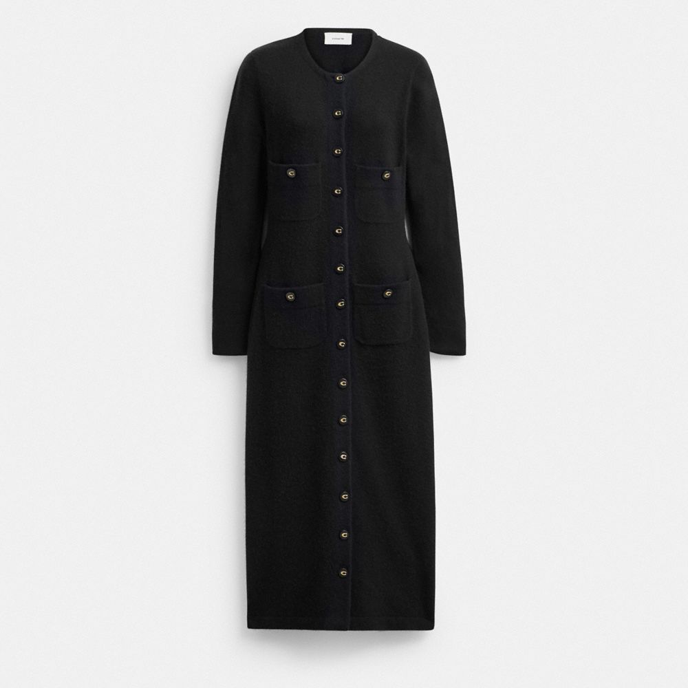 Long and lean, this four pocket cardigan dress is a modern take on a classic style. Crafted in a soft mix of wool and cashmere detailed with our Signature enamel buttons, the long-sleeved silhouette is finished with a back vent for easy mobility.