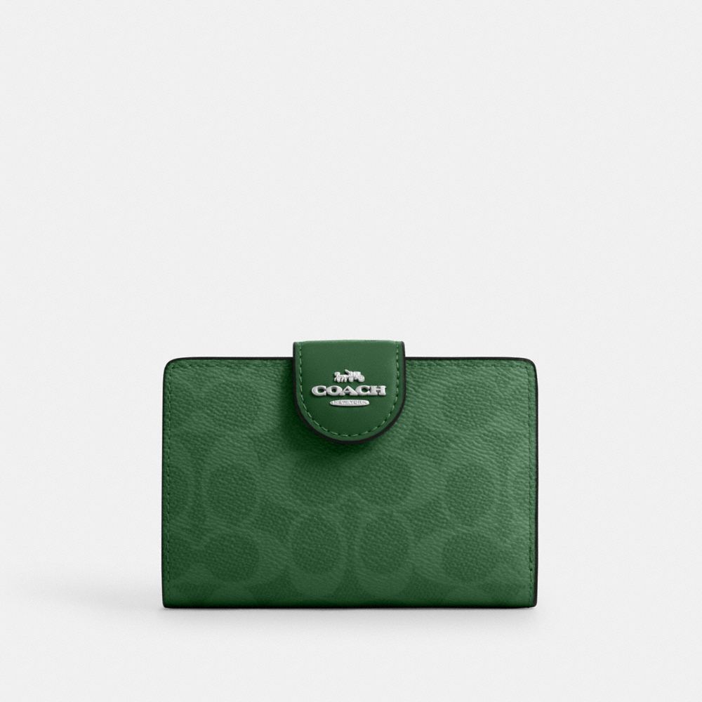 COACH®,Medium Corner Zip Wallet In Signature Canvas,Bi Fold,Coin,Sustainable,Casual,Green,Front View