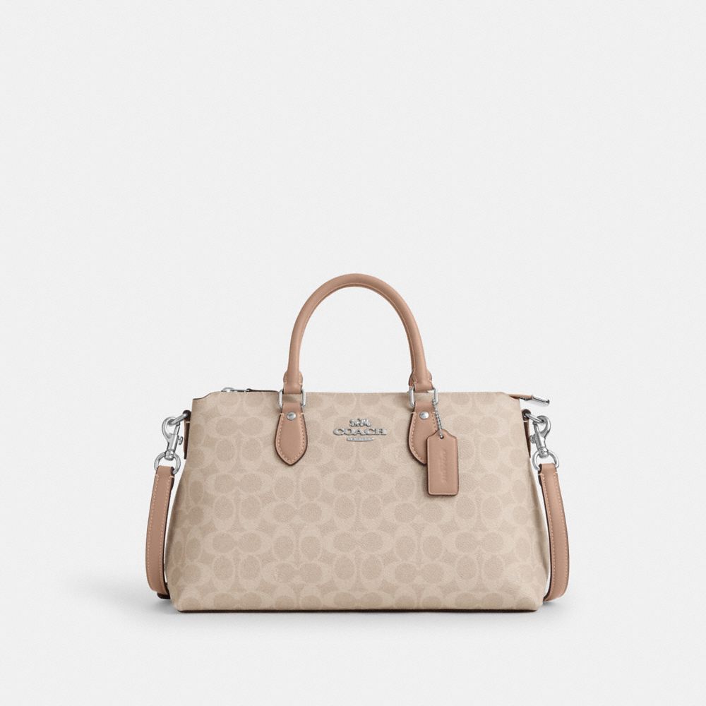 COACH®,Georgia Satchel Bag In Signature Canvas,Satchel,Studded,Adjustable,Gold Metal,Casual,Work,Beige,Front View