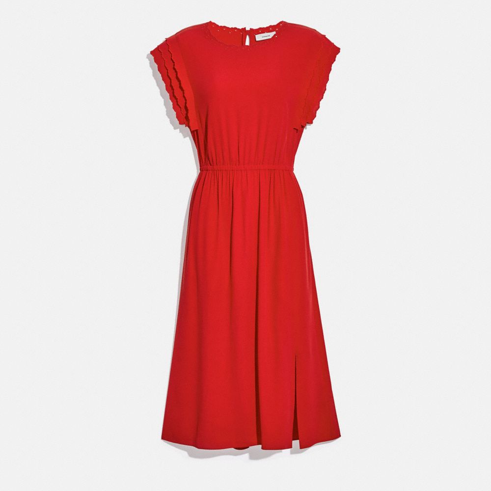 Go for pleat perfection with this lightweight dress detailed with triple-pleated flutter sleeves. The midi style features delicate eyelet embroidery, a key-hole back and a shape-defining elasticized waistband.