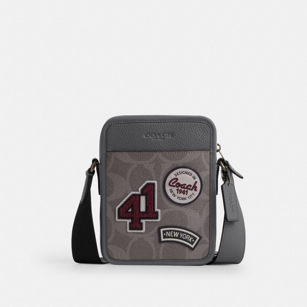 COACH®,Sullivan Crossbody Bag In Maxi Signature Canvas With Patches,Calfskin Leather,Canvas,Leather,Crossbody,Applique,Log...,Gray,Angle View