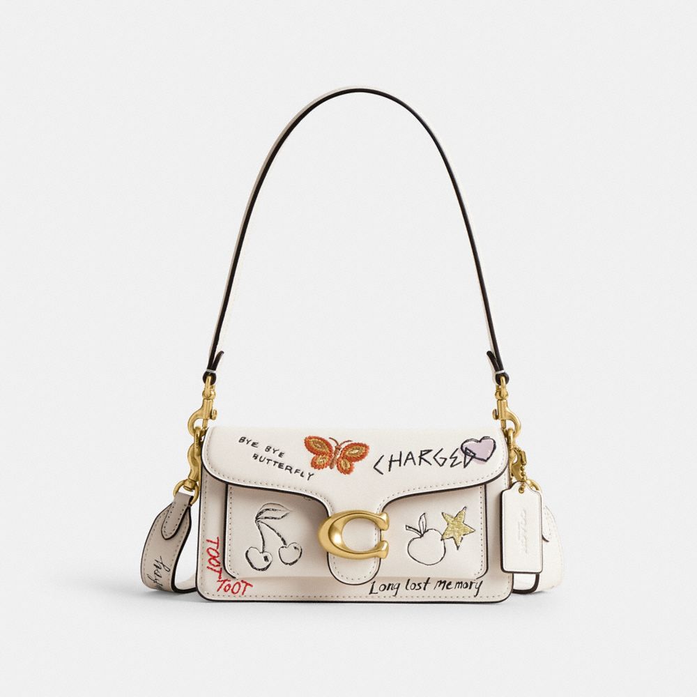 A modern take on an archival 1970s Coach design, our structured Tabby shoulder bag is crafted of buttery soft glovetanned leather featuring our Coach Sketch print, a playful doodle motif of whimsical drawings and phrases inspired by artistic notebook scribbling. Smaller than the 26, the petite 20 features two detachable straps to carry by hand, style as a short shoulder bag or wear crossbody. It’s finished with our Signature hardware for an iconic touch.