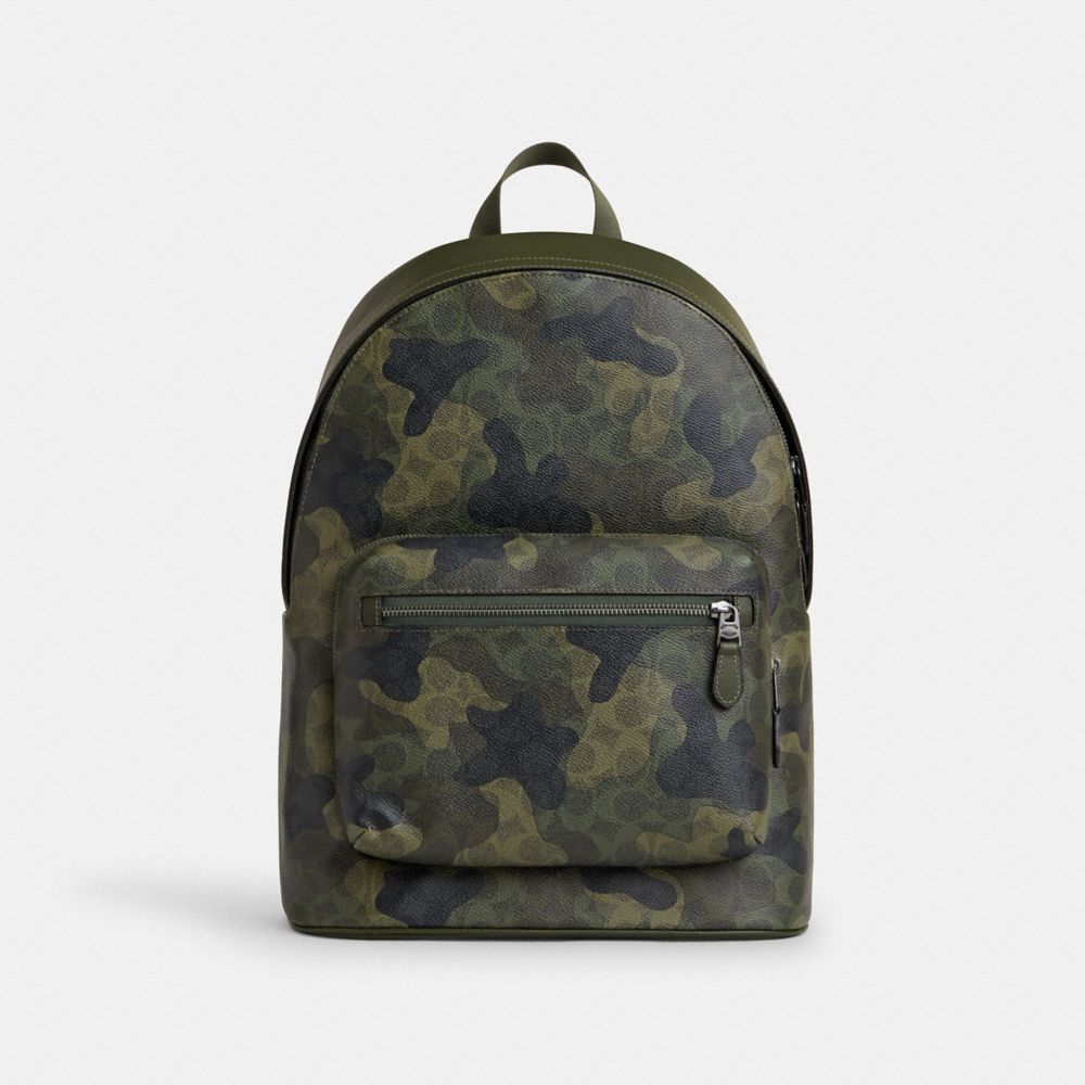 The West Backpack is perfect for commuting to work or exploring the city. Crafted of Signature coated canvas and smooth calf leather, this men's designer camo backpack carries all your essentials, including up to a 15" laptop. It features a spacious main compartment with a zip closure, plus an outside front pocket ot keep your top items handy. A classic silhouette, this work backpack for men will never go out of style.