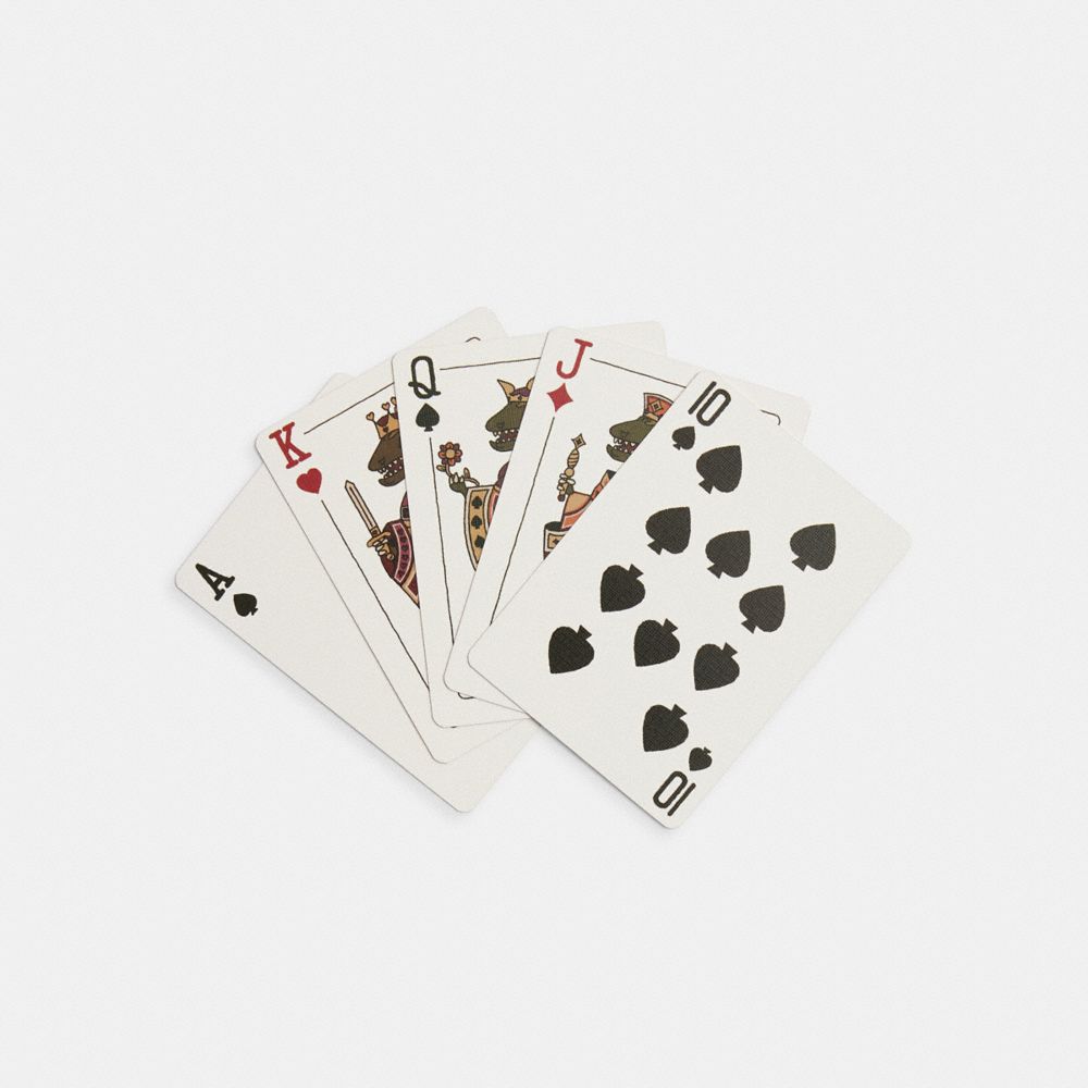 Apportez une touche signature à votre soirée de jeux avec nos cartes à jouer illustrées à la main et imprimées sur du papier épais fait sur mesure. Mettant en vedette notre mascotte Rexy réinventée pour représenter chaque membre de la suite royale, les cartes présentent au dos une interprétation de notre motif signature et une bordure dorée. Comme tous les cadeaux Coach, celui-ci est emballé dans une boîte-cadeau Coach, prêt à offrir et à recevoir.